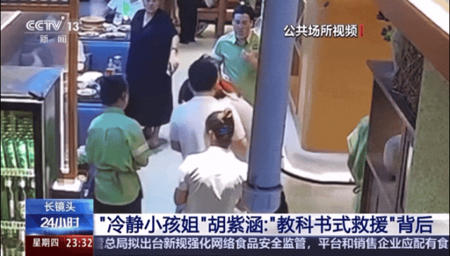 在她做手势求助的过程中,周围人束手无策。只有 11 岁的胡紫涵冲上前,并立刻用海姆立克法对其进行抢救。