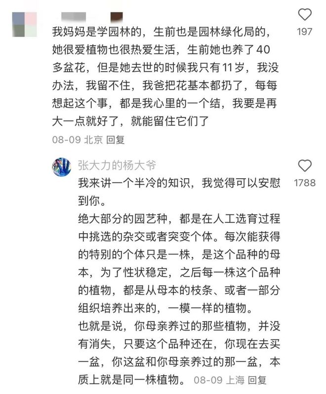 “你母亲养过的那些植物,并没有消失,只要这个品种还在,你现在去买一盆,你这盆和你母亲养过的那一盆,本质上就是同一株植物。”